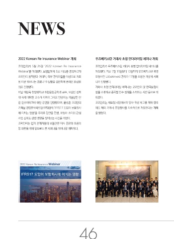 2022 Korean Re Insurance Webinar 개최 우즈베키스탄 거래사 초청 언더라이팅 세미나 개최 2022회기 하반기 조회 개최 기후리스크TF 월례포럼 개최